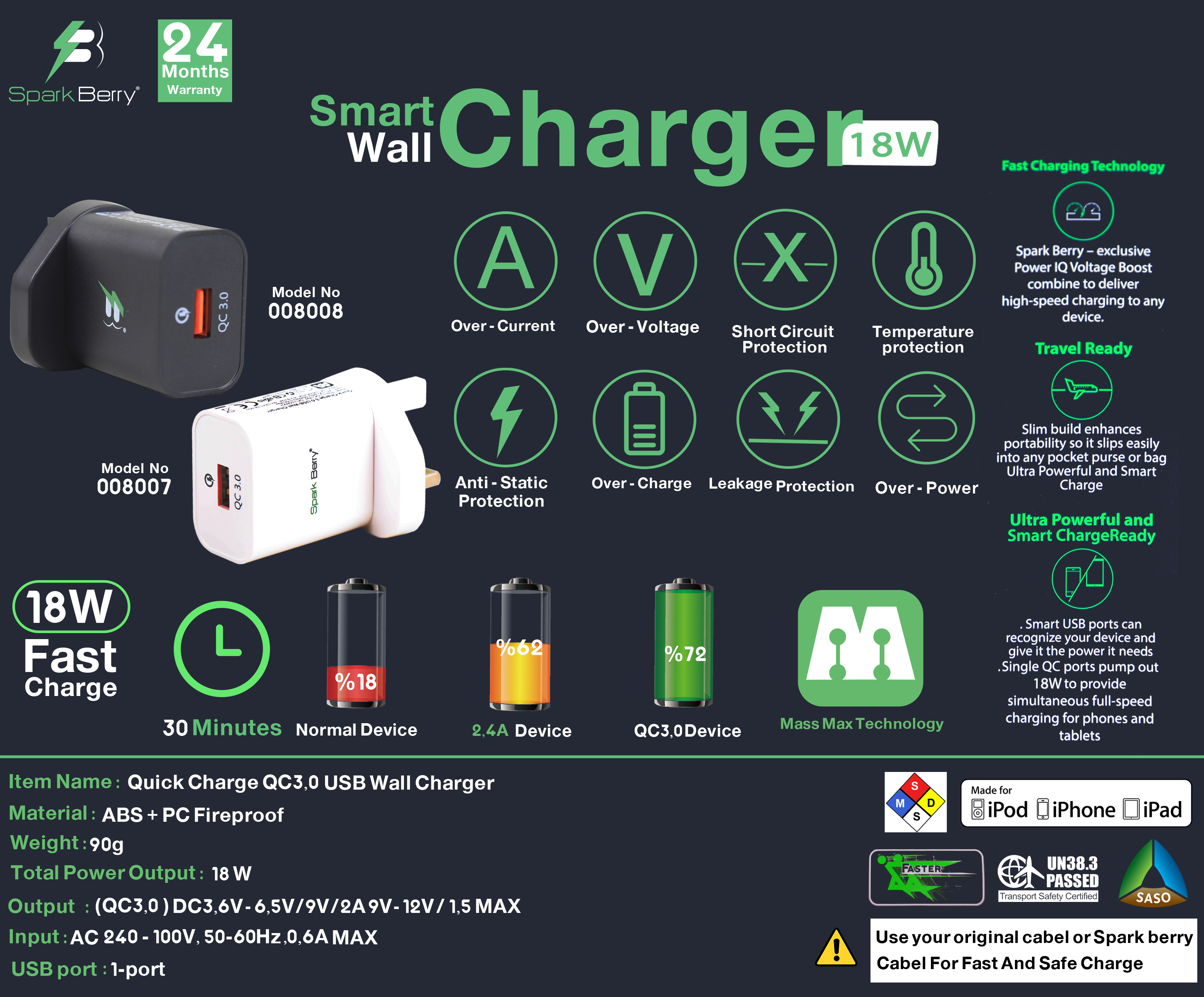 - الشاحن مقاوم للاشتعال وذلك بسبب تصنيع بمادة ABS و PC Fireproof المقاوة للأحتراق وحماية الدوائر الإلكترونية.