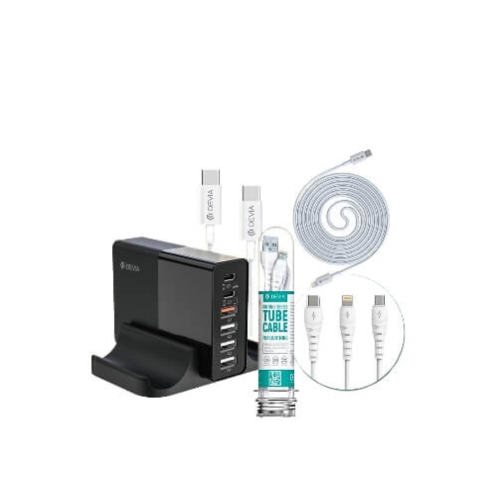 - محتويات العرض شاحن سطح المكتب متعدد المنافذ + كابل شاحن تايب سي + كيبل كنتون ايفون إلي يو اس بي 1 متر + كابل شاحن مايكرو يو اس بي .