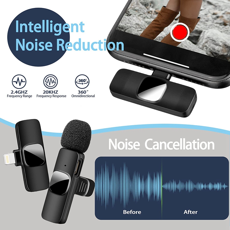 ميكروفون لاسلكي K8 لاجهزة الايفون لتسجيل الفيديوهات والبث المباشر هو ميكروفون صغير وخفيف الوزن يتميز بتقنية البلوتوث 5.0 التي توفر اتصالًا مستقرًا وسريعًا. كما أنه يتميز بخاصية إلغاء الضوضاء التي تساعد على تسجيل صوت نقي وواضح حتى في البيئات الصاخبة.