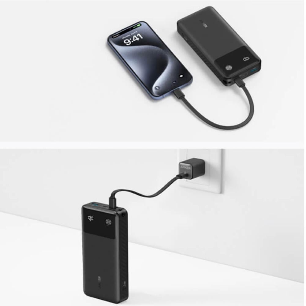 باور بانك أنكر 20000 مللي أمبير - 30 واط، 2 منفذ تايب سي ومنفذ USB مع سلك تايب سي - أسود