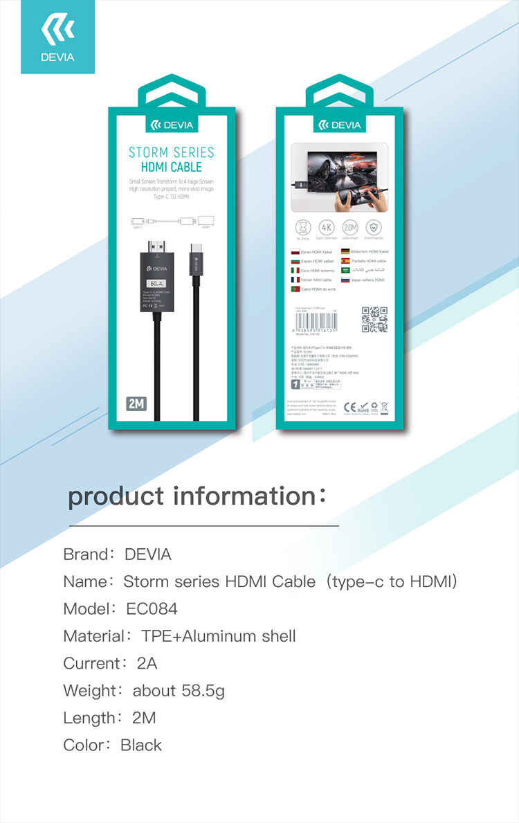 محول كيبل Storm Series Type C إلى HDMI هو محول عالي الجودة يسمح لك بتوصيل جهازك الذي يدعم منفذ Type-C بجهاز عرض أو تلفزيون مزود بمنفذ HDMI.